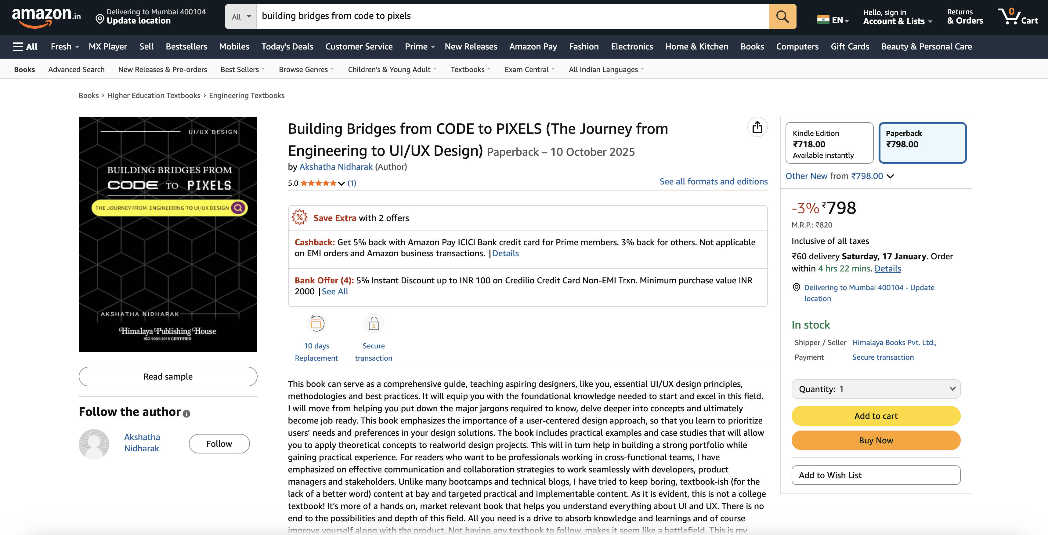 Building Bridges from Code to Pixels is a practical guide for anyone looking to enter UI and UX design with clarity and confidence. The book focuses on fundamentals, real workflows, and the thinking behind design decisions, drawing from industry experience rather than theory alone. It is written to help readers understand how products are shaped, built, and improved in real teams.